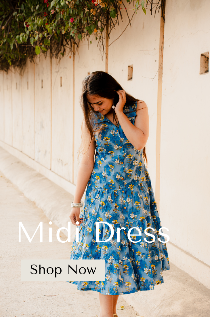 A soft cotton A-line dress featuring elegant blue floral prints and a relaxed silhouette. Perfect for brunch outings, vacations, and sunny afternoons. Designed for maximum comfort with a graceful feminine flow.