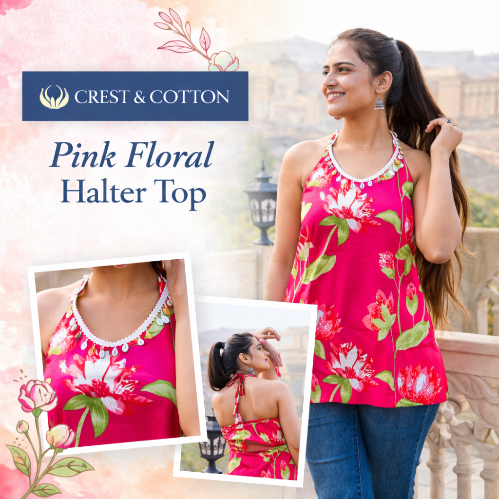 Add a vibrant pop to your wardrobe with our Pink Floral Halter Top. The breathable cotton fabric and playful floral pattern make it ideal for casual outings, summer days, and travel styling.