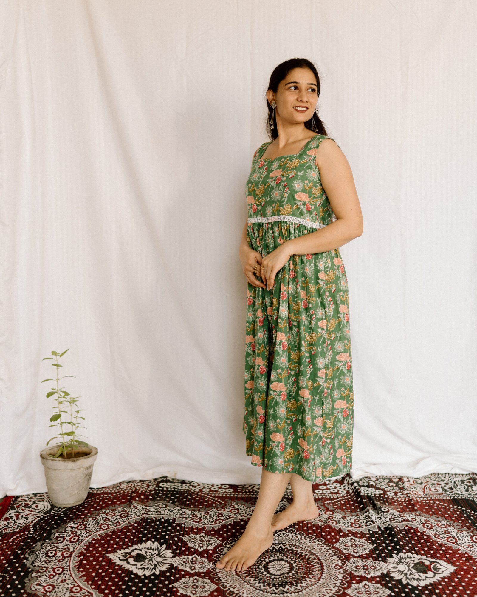 Sage Green Floral Printed Cotton Midi Dress