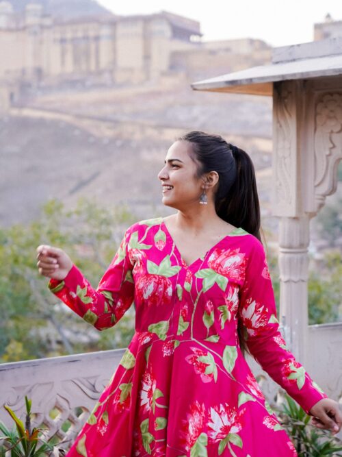 Hot Pink Floral Printed Anarkali Set plazo + gown